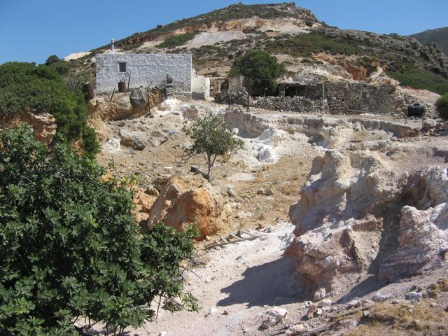 L’arrivée dans le cratère immergé est somptueuse… Mais après un cap qui nous cachait le fond de la baie, nous découvrons le port et là les petits amis, le choc ! Après Sikinos où, souvent, nous étions le seul voilier dans le port et où le maire nous saluait tous les jours, la transition fût brutale en arrivant à Adamas, port de Milos: près de 2000 habitants, du bruit, beaucoup de véhicules, des touristes gogos et à gogo,...Mais que sommes-nous donc venus faire dans cette galère!? D'abord : se mettre au mouillage, assez loin de cette ambiance et trouver un petit coin à l'ombre sur la côte pour débarquer avec l'annexe. Objectifs atteints rapidement d'autant que la baie est grande et que le premier accueil des anciens est plutôt sympa.