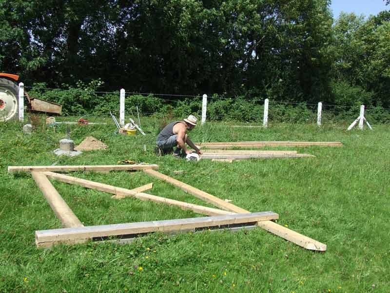 L’idée de Céline a été reprise lors de notre conseil de communauté en début d’année. Nous attendions la londonienne pour nous mettre au travail. Grâce au tracteur et sa remorque bien réparée, j’ai pu ramener les matériaux. Nous avons fait les plans ensemble et vogue la galère… Heureusement Catherine et Philippe nous ont donné un coup de main. nous sommes fiers de nous et du résultat final. Pourvu que les chevaux apprécient leur nouvelle demeure. Resteront la pose de la gouttière, de la porte d’entrée depuis le chemin et l’aménagement du coin pour le foin. Bien fatigués quand même au final! Nous attendons Nicolas pour l’extension du hangar.