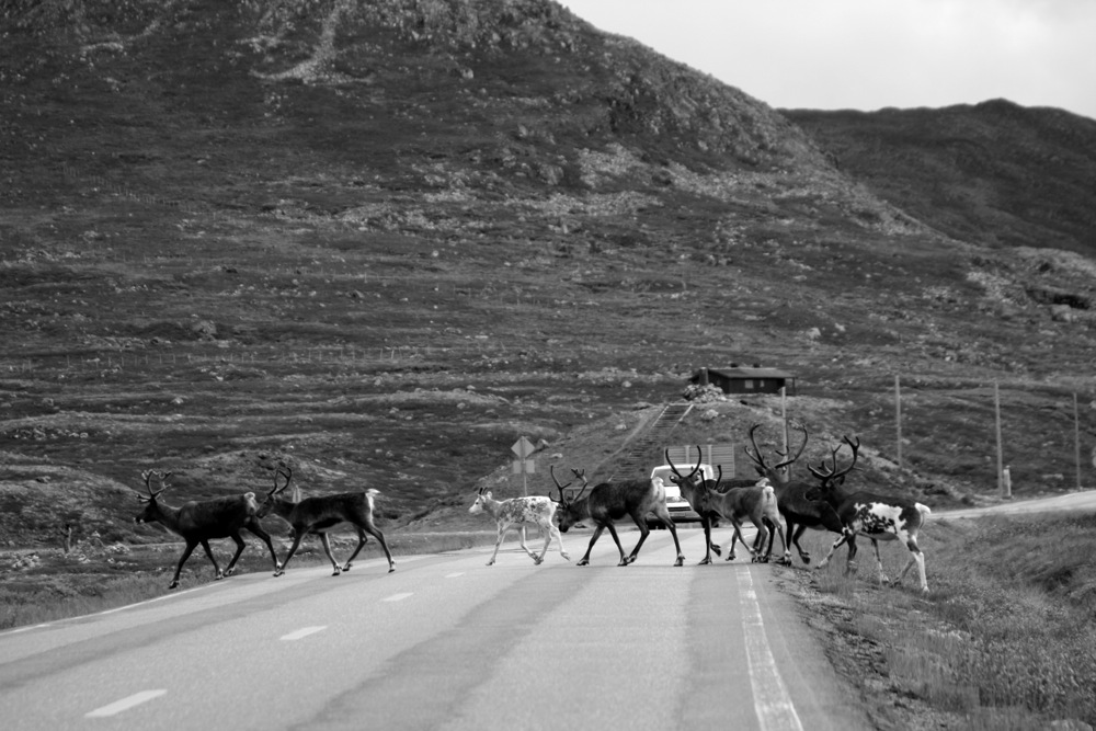Visite de l’église en bois debout du 12e siècle de borgund, réputée pour être la plus authentique des 28 eglises restantes de ce type, sur plus de 1000 au moyen-age. le bois utilisé est celui d’origine : cela fait 800 ans que cette église tient debout! Le melange utilisé pour préserver le bois est constitué de résine et de charbon bouillis, d’où son aspect noir caractéristique. le même mélange était utilisé par les vikings pour assurer l’étanchéité de leurs drakkars. leur construction a été arrêtée nette au 14e à cause de la grande peste. finalement, les églises ayant été les mieux préservées sont celles qui appartenaient a des communautés relativement pauvres qui n’avaient pas les moyens de les modifier au fil du temps. petite pause pour une soupe qui réchauffe au musée proche de l’eglise puis nous reprenons la route pour amorcer doucement notre retour vers le sud. Sur les hauts plateaux, surprise… Des rennes ! Des troupeaux entiers ! Nico s’emballe, et ses yeux traquent les moindres mouvements sur les flancs des montagnes nous entourant. Nous en auront vu finalement six ou sept groupes cet après-midi. Le spectacle est à la hauteur de l’attente :-) le soleil daigne nous rejoindre et sublime les paysages qui nous entourent tandis que nous deambulons dans la vallée d’hemsedale. La chance nous sourit et nous trouvons une hutte avec balcon au soleil au-dessus de la rivière, le panard! Quelle après-midi! Cela se termine par des photos de pêcheurs à la mouche au soleil couchant et par un apéro au foie gras périgourdin.